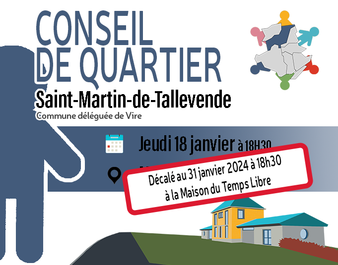 Le service démocratie participative et les élu.e.s de Vire Normandie vous donnent rendez-vous à la Maison du Temps Libre pour son conseil de quartier, le mercredi 31 janvier à 18h30.