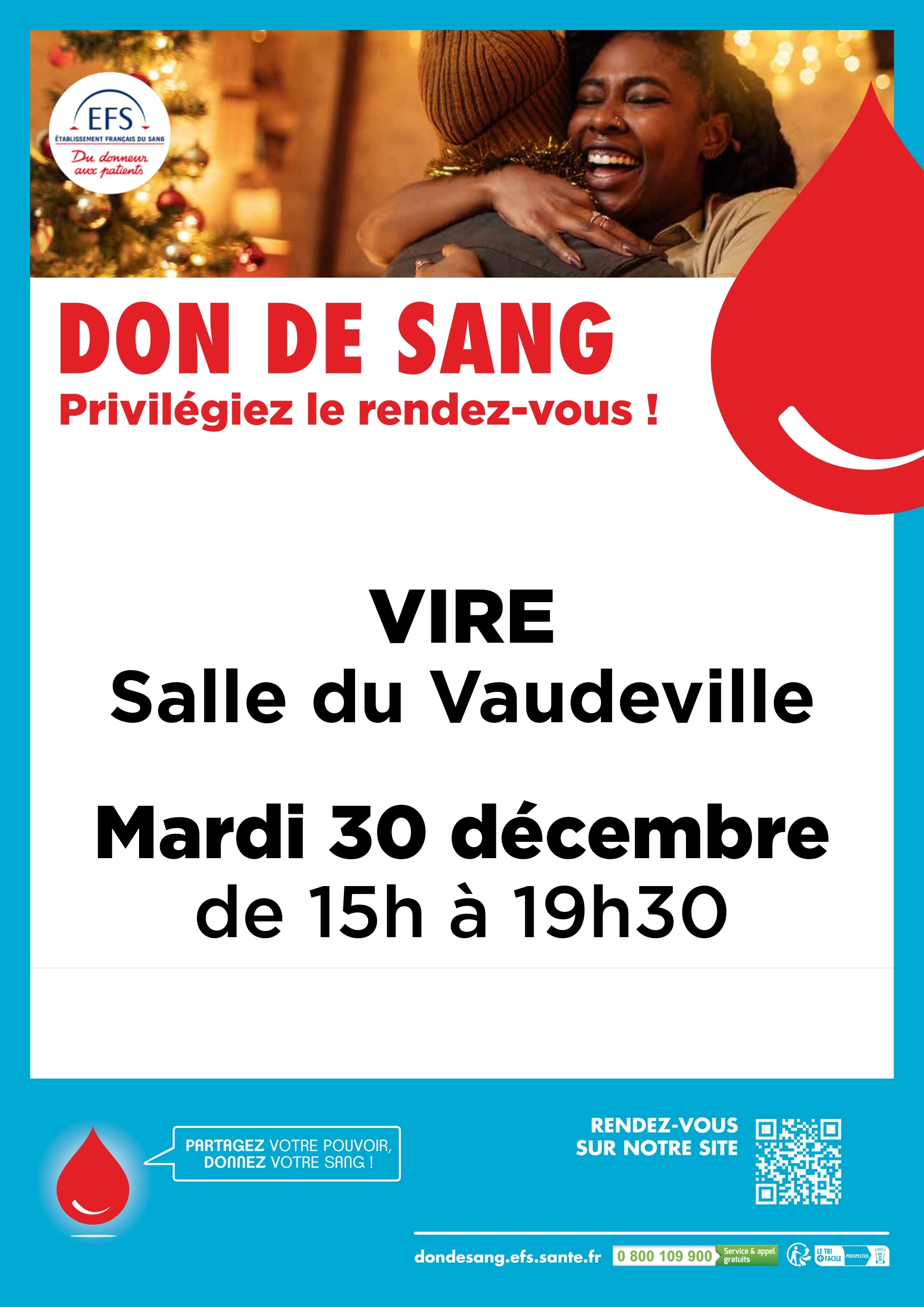 La commune de Vire Normandie accueillera une nouvelle collecte de sang organisée par l’Établissement Français du Sang, le mardi 30 décembre, de 15h à 19h30, à la Salle du Vaudeville.